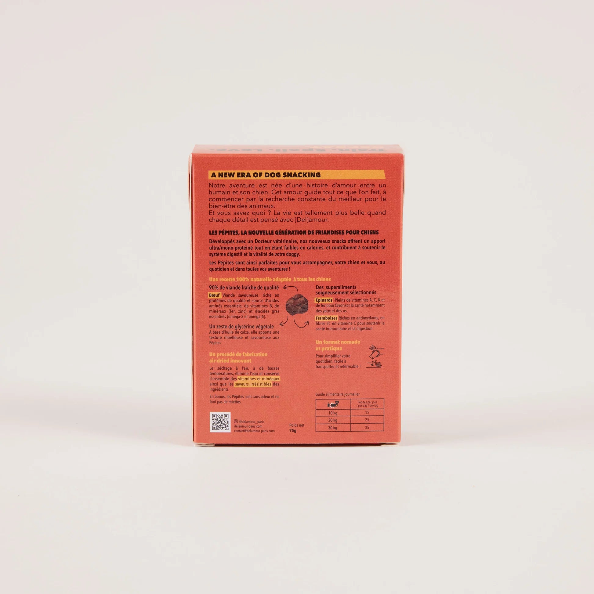 Avec 90% de viande fraîche de bœuf , sublimée par des framboises et des épinards, nos Pépites associent le plaisir de la viande à des ingrédients riches en fibres et antioxydants. Préparées grâce à la méthode innovante séchée à l'air libre , elles conservent toute la valeur nutritionnelle et la gourmandise de leurs ingrédients, sans miettes ni odeurs.