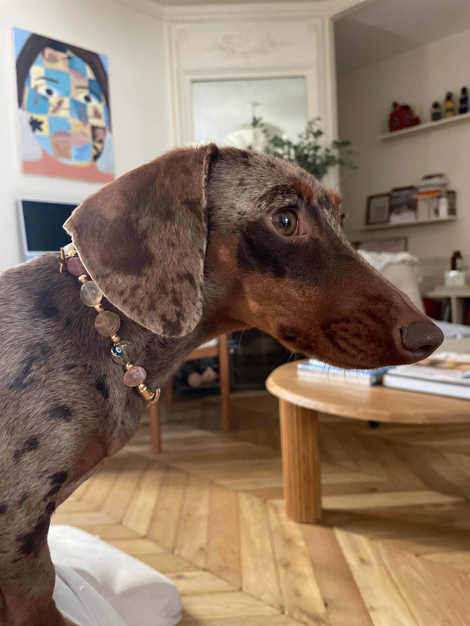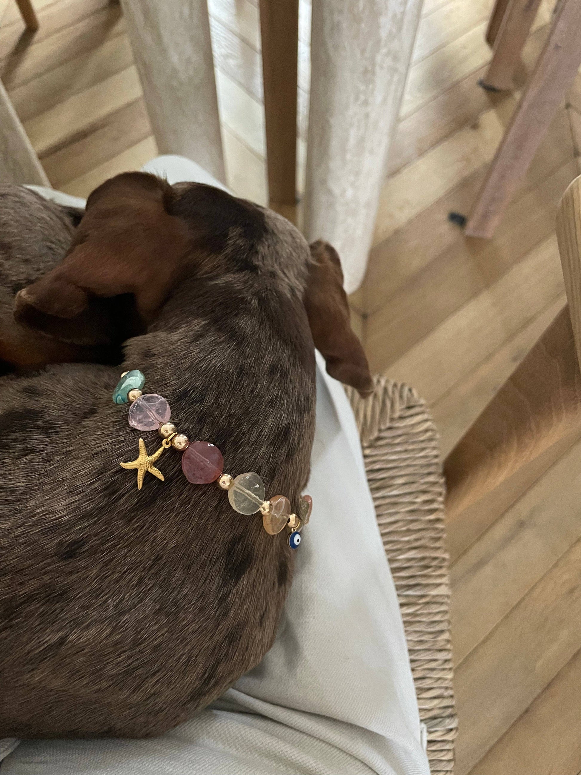 The Calypso collar is a true ode to summer! With its slightly transparent multicolored beads, lucky eye charms, and a golden starfish at the center, it reveals all its shades and beauty in the sunlight. Its flat beads, slightly larger than those on our other colorful models, make it an ideal alternative for larger dogs or those with denser fur.