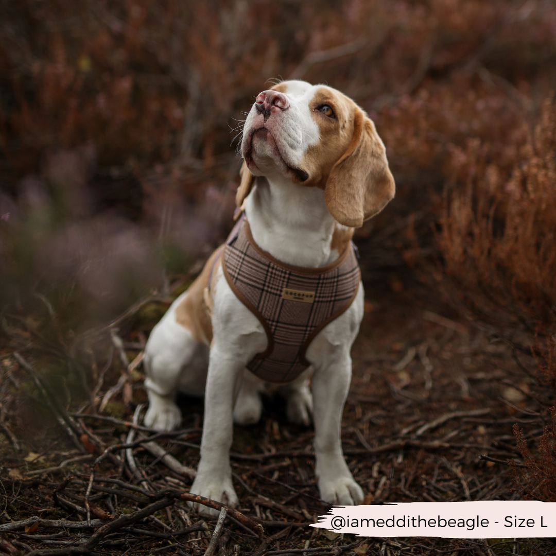 Add a touch of country charm to your pup's walk with our Pup Plaid Adjustable Neck Harness. Featuring a trendy tweed design and a classic tartan pattern in chocolate brown, this harness keeps your dog safe with its safety feature lock. Perfect for a stylish stroll!
